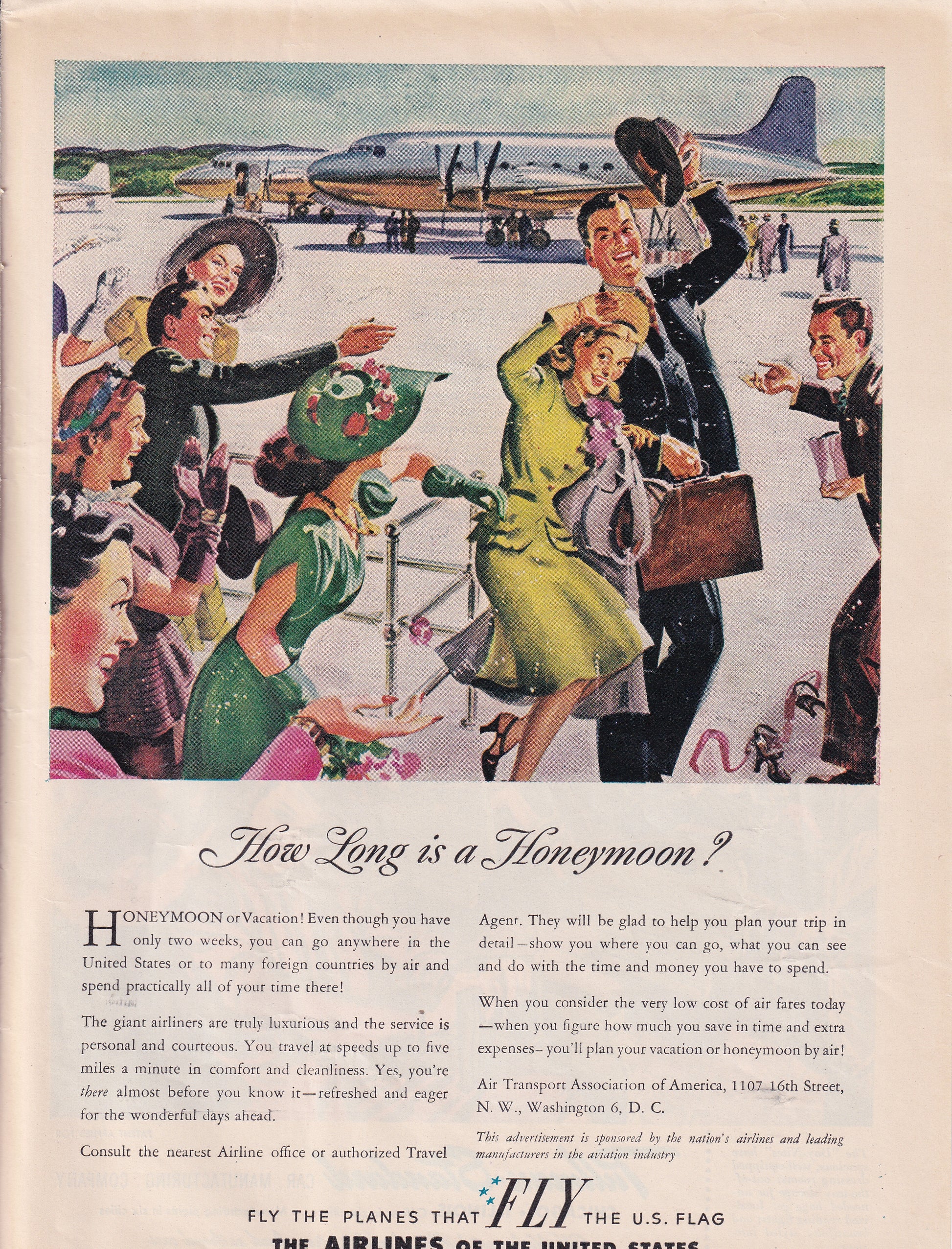 1946 Original Vintage Magazine Ad - Rare Americana - Airlines of United States How Long is a Honeymoon