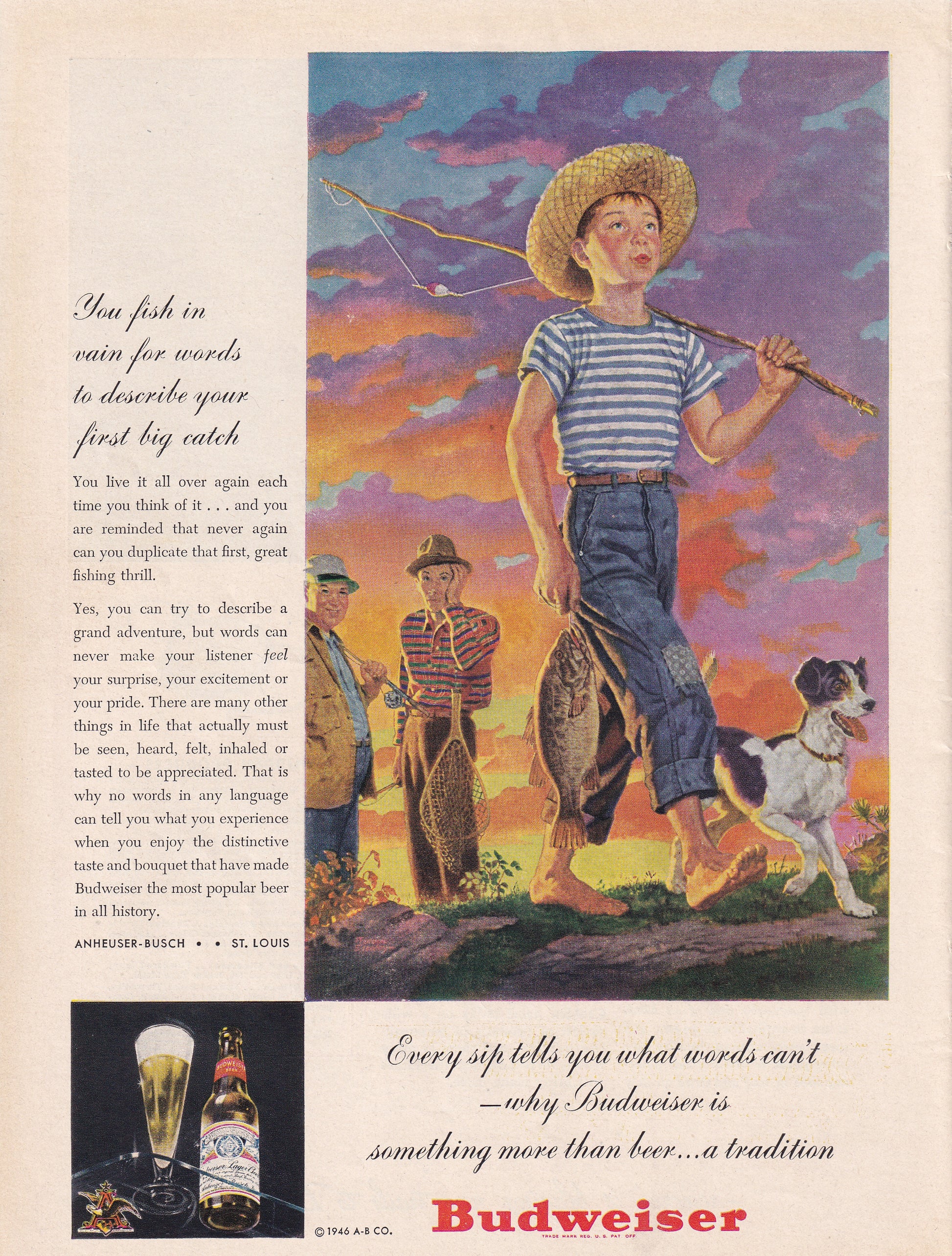 1946 Original Vintage Magazine Ad - Rare Americana - Budweiser Beer Boy and Dog Fishing