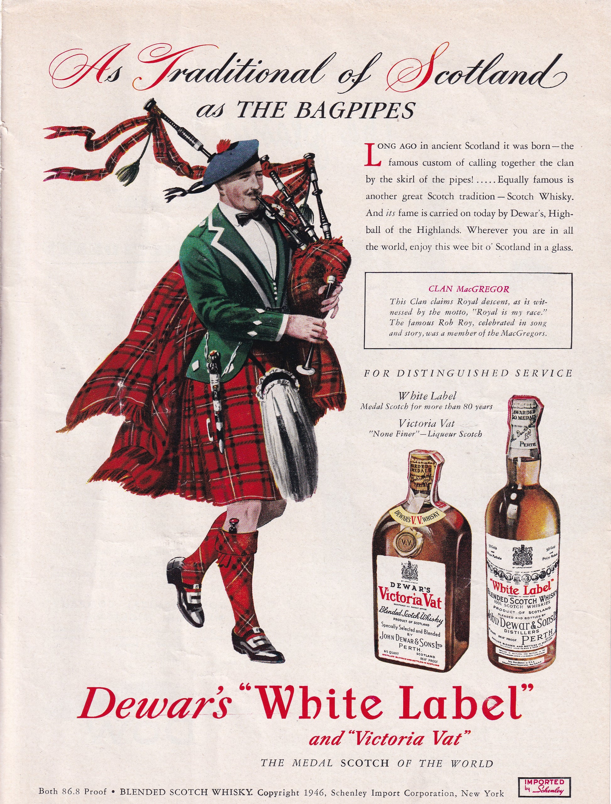 1946 Original Vintage Magazine Ad - Rare Americana - Dewar's White Label Traditional as Bagpipes Victoria Vat