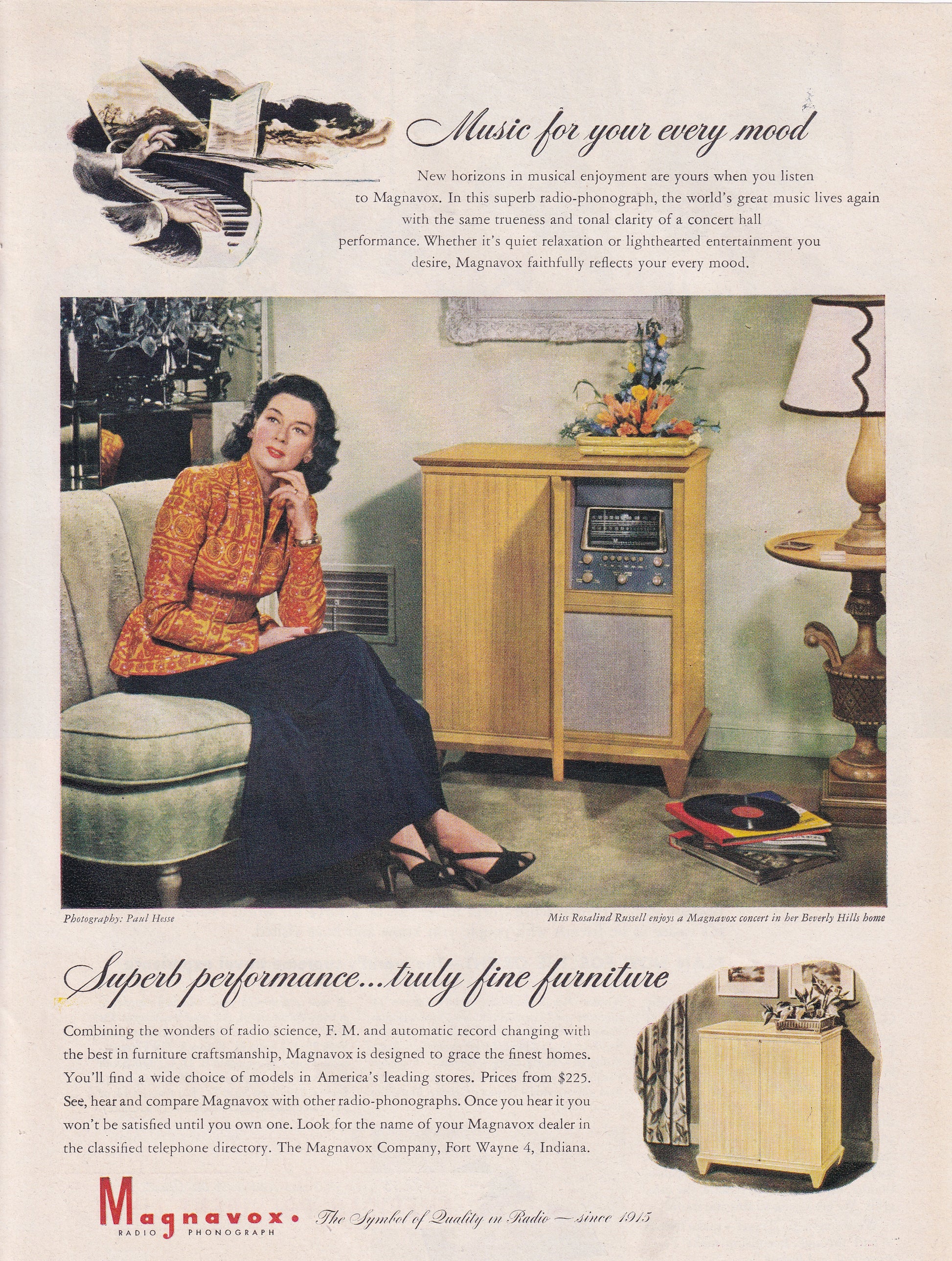 1946 Original Vintage Magazine Ad - Rare Americana - Magnavox Phonograph Radio Ms. Rosalind Russell