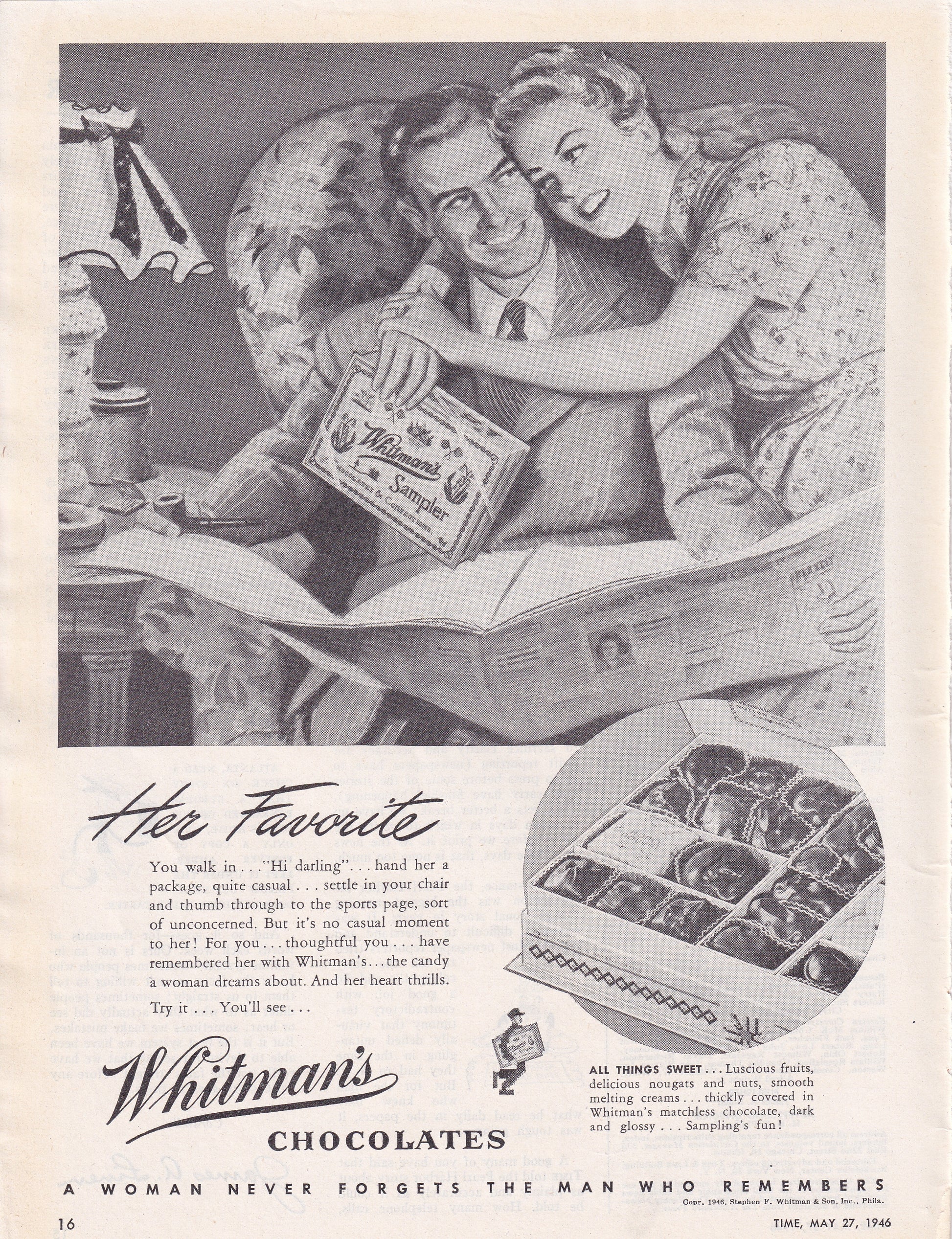 1946 Original Vintage Magazine Ad - Rare Americana - Whitman's Chocolate Sampler Her Favorite