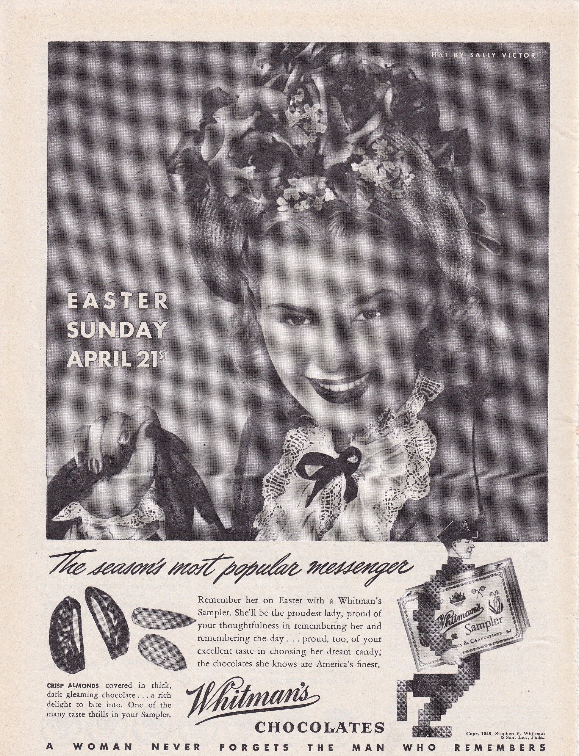 1946 Original Vintage Magazine Ad - Rare Americana - Whitman's Chocolate Sampler Easter Sunday April 21st