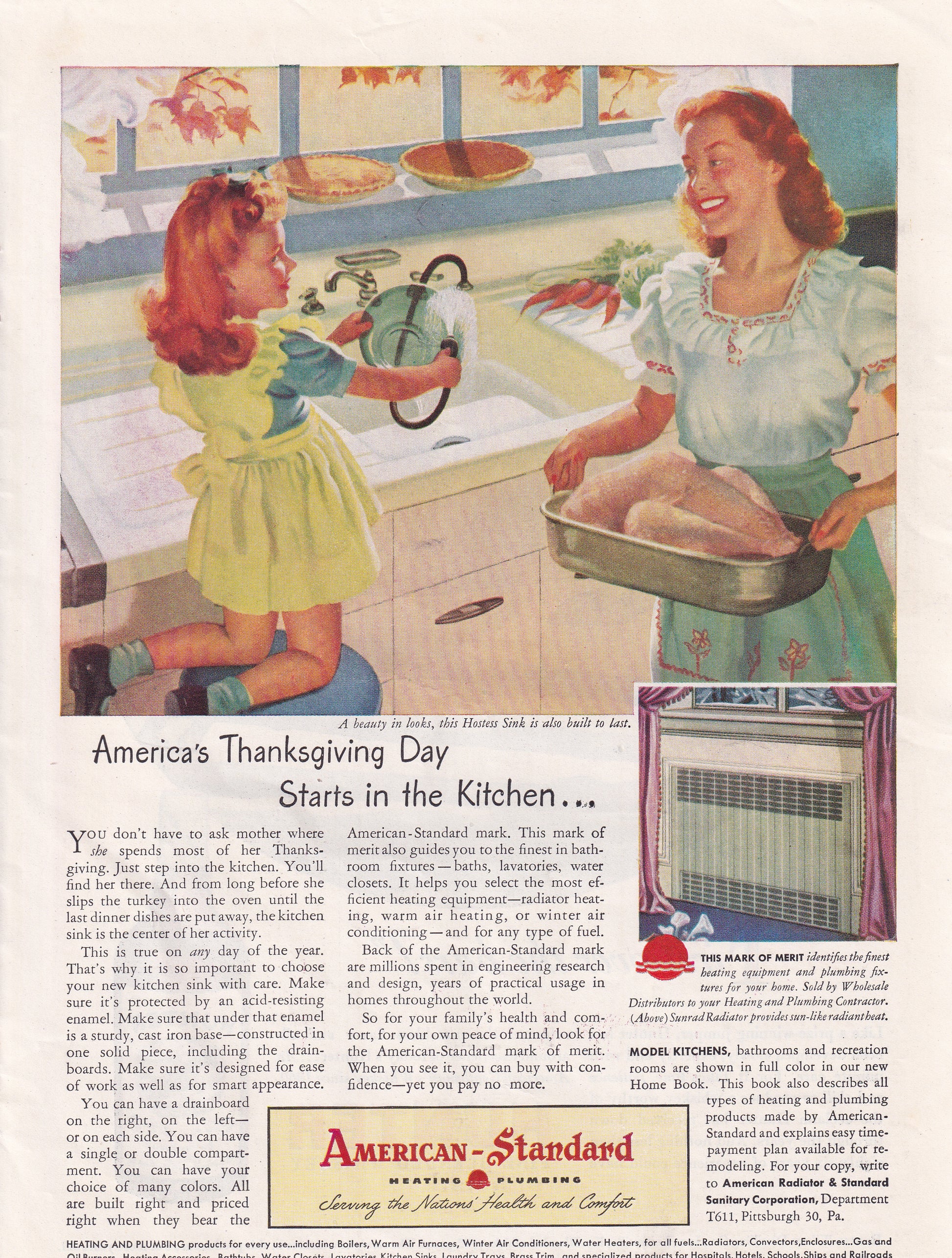 1946 Sexist Original Vintage Magazine Ad - Rare Americana American Standard Mother Always in the Kitchen