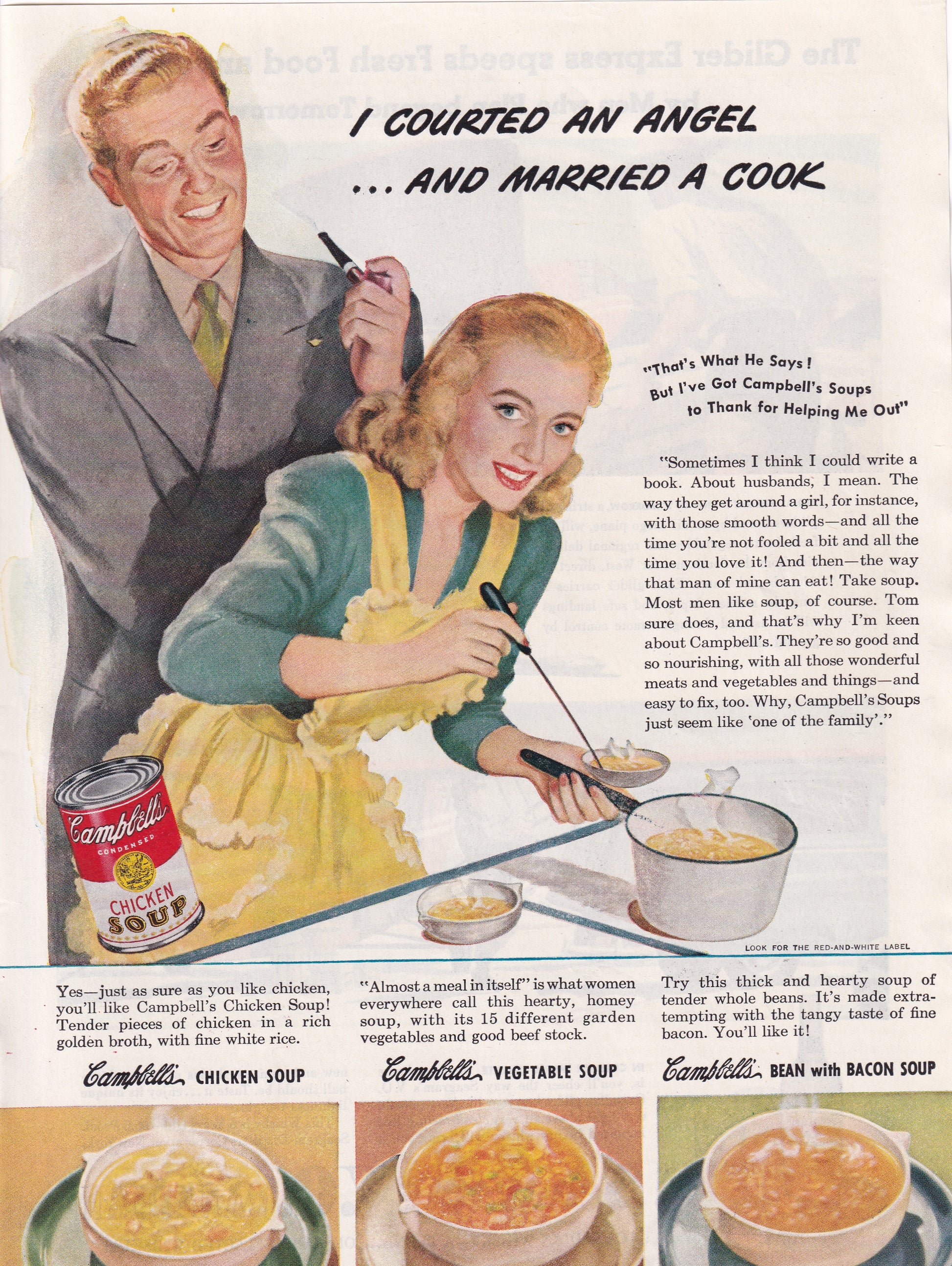1946 Sexist Original Vintage Magazine Ad - Rare Americana - Campbell's Chicken Soup Married a Cook